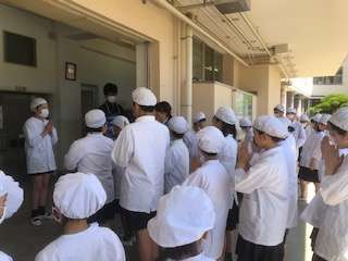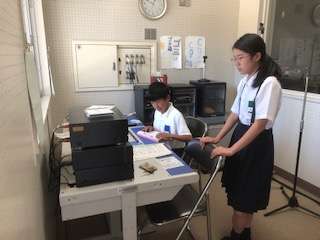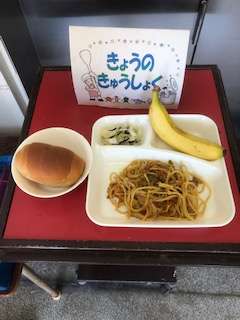 今日の献立は、スパゲティです。給食中も、放送委員会が楽しい音楽をかけてくれています。