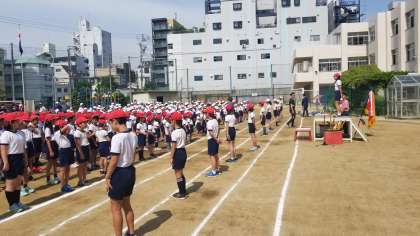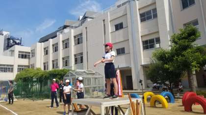 校歌斉唱、ラジオ体操の隊形の練習の様子です。各場面で子どもたちがリーダーとなり活躍する姿があります。