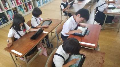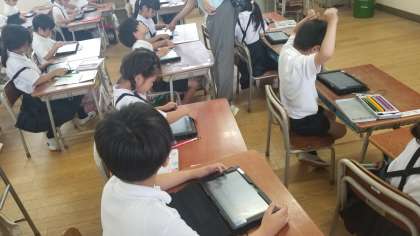 1年2組の図工の様子です。タブレットを使ってお絵かきをしています。使った後はきちんと保管庫にもどすこともできました。