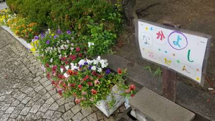 なかよし花壇の花が雨に濡れてとてもきれいです。