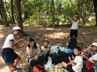 お弁当の様子です。雨が降らずに良かったです。日ごろの行いの良さですね。