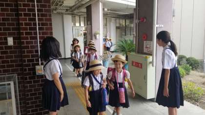 毎朝、地下道と正門にあいさつ当番があいさつ運動を行っています。