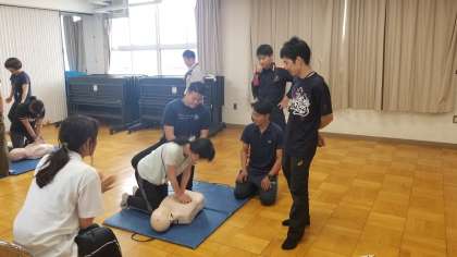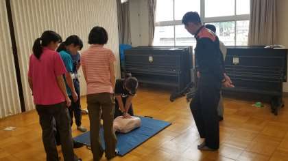 本日の放課後、多目的室で教員の救急救命講習を実施しました。来週からの水泳指導を控えて、天王寺消防署の方に指導していただきました。