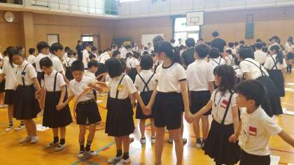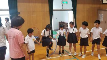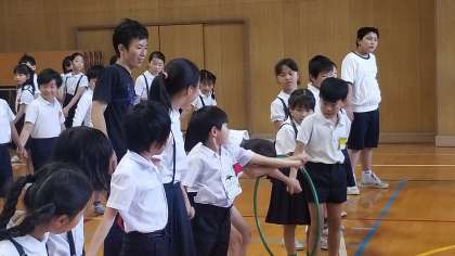 本日体育館で児童集会を実施しました。今日は縦割り班毎に手をつないで輪をくぐるゲームです。