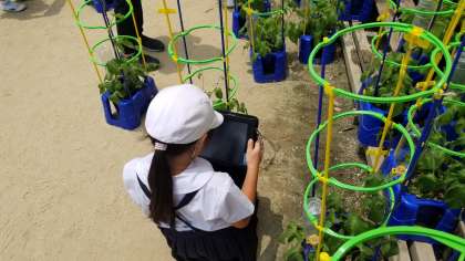 1年1組の児童が朝顔の成長をタブレットに記録しています。