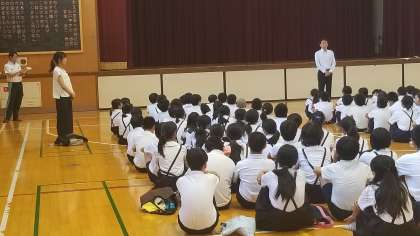 最初に体育館で校長先生の挨拶と説明がありました。