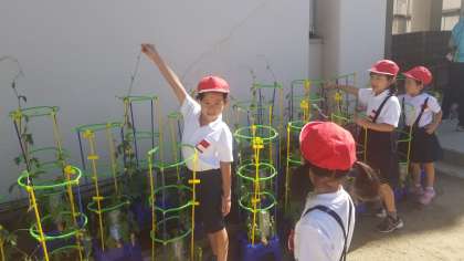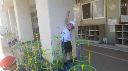 1年生の児童が「先生、こんなに長くなったよ」と朝顔のつるが成長した様子を見せてくれました。