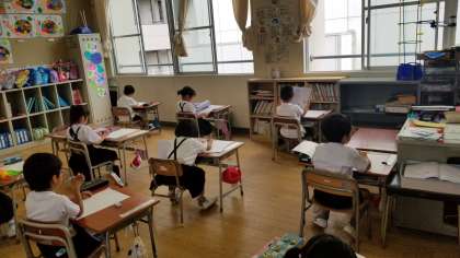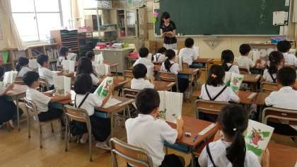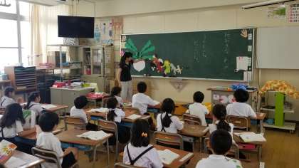 2組は国語です。大きなかぶの話です。大きなかぶが抜けるように大きな声で読んでいました。