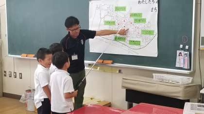 2年2組のせいかつかの様子です。新しいお友だちに、天小の校区について説明していました。