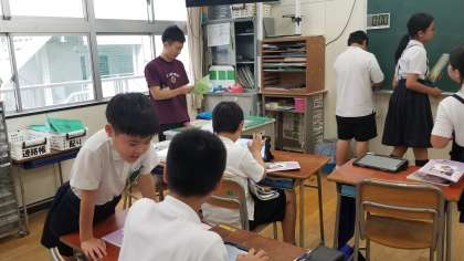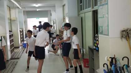 6年生の廊下と教室の様子です。楽しそうに話をしたり、タブレットを操作していました。