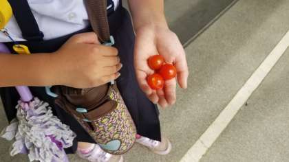 「先生見て。トマト」と自分が育てたトマトを見せてくれました。明日も元気に登校してください。
