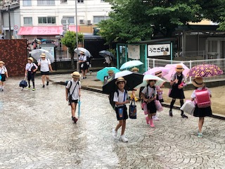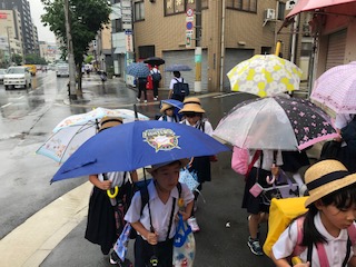 おはようございます。今日は雨天、傘の花が開いた登校風景になりました。
