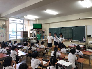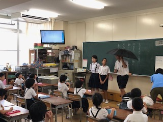 朝の会の時間に、1〜3年生の教室に美化委員会児童が傘の使い方について話しに行きました。委員会の5・6年児童は、たくさん人がいるときの傘の開き方や畳んだ後の持ち方などのマナーについてわかりやすく話していました。1〜3年生もしっかりと聞いていました。