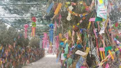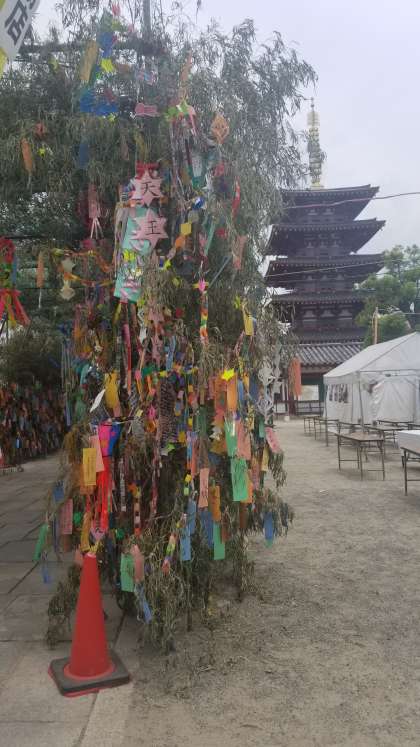 四天王寺さんの七夕まつりに、天王寺区の小学校・幼稚園の竹飾りが展示されています。四天王寺さんの極楽門から西重門に飾られています。