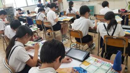 6年2組の図工の様子です。タブレットで運動している様子を写し、それを描いています。点を重ねるように筆を使い立体感のある絵を描いていました。