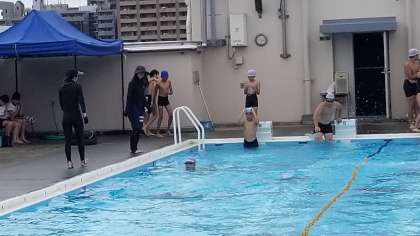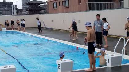 6年生のプール指導の様子です。小雨の中、25mのタイムを計測しています。