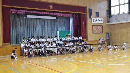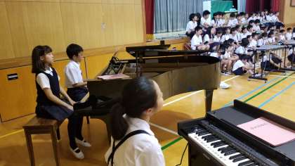 5年生が体育館で、音楽集会の練習をしています。