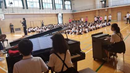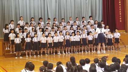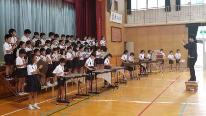 本日、体育館で児童集会を行いました。今日の児童集会は5年生による音楽発表会です。合唱「世界がひとつになるまで」合奏「やってみよう」の2曲を発表しました。