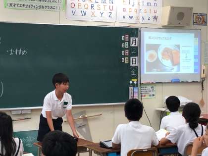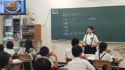 6年2組の家庭科の様子です。自分で考え作った朝食を紹介しています。ワークシートをもとに、発表データを作成して、タブレットを活用して発表しています。