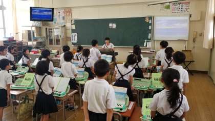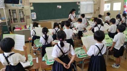1年2組の音楽の様子です。「うみ」「たなばたさま」をきれいに合唱していました。続いて「大阪市歌」「校歌」を元気に歌っていました。歌う姿勢がきれいですね。