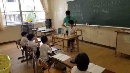 なかよしの授業の様子です。ペットボトルを使って、みずのかさの単位の学習をしています。