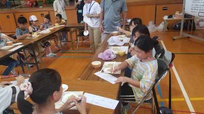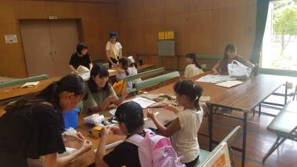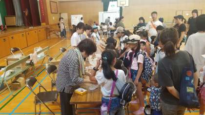 体育館のワークショップの様子です。ブーメランづくり、バスボムづくり、木のオーラメントづくり、豆つかみなどです。