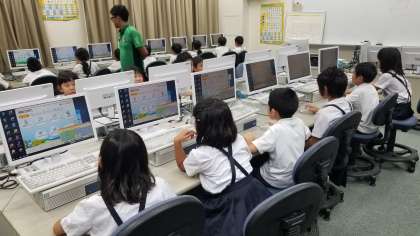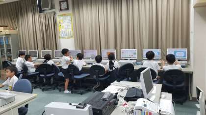 2年2組がパソコン教室で「名刺づくり」をしています。先生の説明をしっかりと聞いて、パソコンを動かしていました。