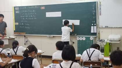 5年生の算数の習熟度別授業の様子です。「一袋3本入りの鉛筆と、一袋4本入りのキャップの数が等しくなるのは何本の時ですか」という問題です。3と4の倍数を調べ考えていました。