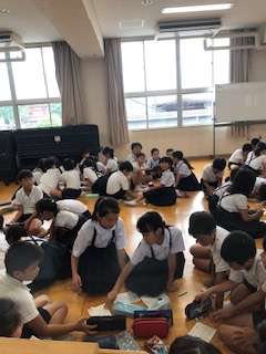午後の授業風景です。4年生は遠足の班編成や役割分担などを話し合っているようですね。5−1は図工、写真をヒントにまだ見ぬ世界の色や形を想像して絵に表しています。6年生は、文章を入れたスライドを作成しています。