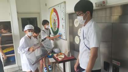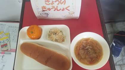 給食係の児童が今日の給食のサンプルの蓋をとって写真が撮れるようにしてくれました。この児童は今日は当番ではありませんが自主的に活動してくれています。ありがとう。