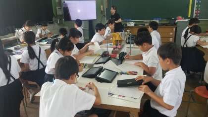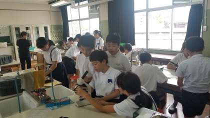 5年1組の理科の様子です。かぼちゃの花から、おしべやめしべのつくりを調べ、花粉を顕微鏡で観察しています。
