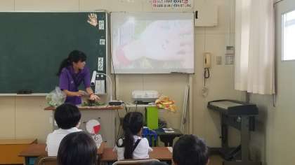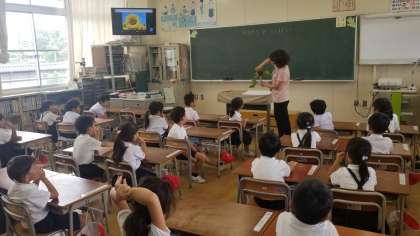1年生が自分たちで育てたひまわりから種を取り出しました。先生が一掴みした中から、10個以上の種があるのを確認すると「わー」という声があがりました。