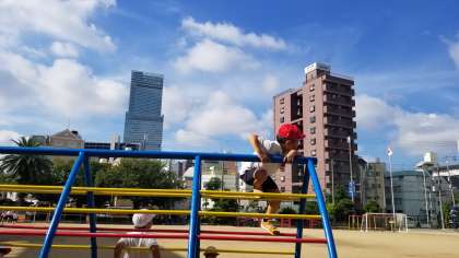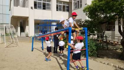 朝の様子です。青い空に子どもたち。今日も元気に遊んでいます。