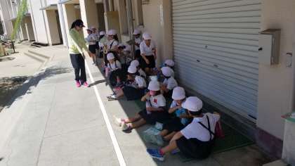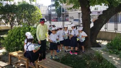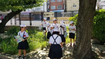 1年2組のせいかつかの様子です。夏と秋の生き物をさがしています。ビオトープ、学習園などで活動しました。水分補給もばっちりです。