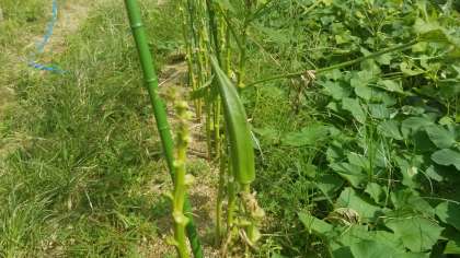 2年2組のせいかつかの様子です。学習園でオクラや茄子の観察を行いました。「先生、オクラの実が縦に生(な)ってた。」と新たに発見したことを教えてくれました。「すごい発見やな」と言うと、「スーパーでもとがった方を下にして並べてあるから、あんなふうにできていると思わなかった。」と返してくれました。子どもたちが物事をしっかりと見ていることに改めて感心しました。