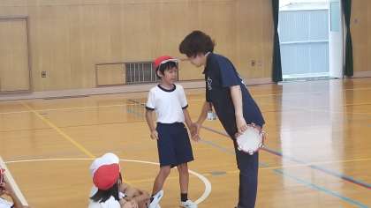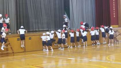 1年1組の体育の様子です。準備運動では体育館を縦に走り、舞台に上がって降りてきます。各班が全員そろったら先生に報告して座ります。みんな、しっかりと先生の指示通り活動することができていました。