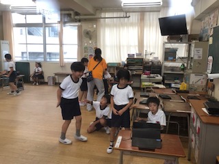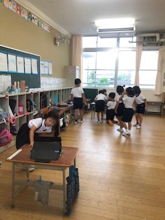 1年2組の授業の様子です。ICTの追っかけ再生機能を活用して授業をしています。研究授業でも活用する予定です。