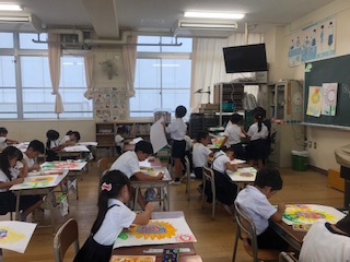 1年1組の図工の様子です。生活科で育てたひまわりの絵を描いています。種の部分を細かく表現することができています。