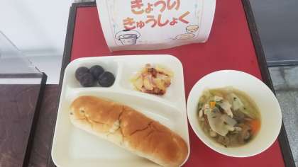 今日の給食は、鶏肉とてぼ豆のスープ煮、じゃがいもとトマトのチーズ焼き、ぶどう(巨峰)、パン、牛乳です。