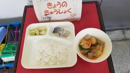 今日の給食は、さごしの塩焼き、じゃがいもと一口がんもの煮もの、キャベツのおひたし、ごはん、牛乳です。