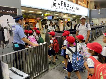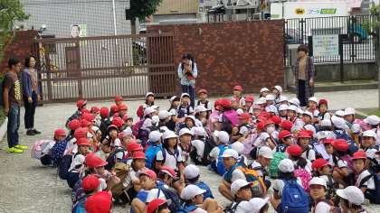 1・2年生が遠足に出発しました。付添の先生の確認をしています。皆で楽しい遠足にしましょう。
