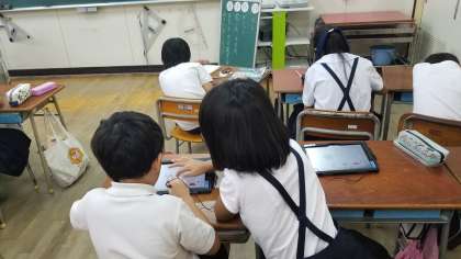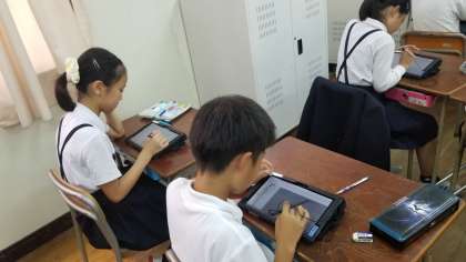 5年2組の授業の様子です。タブレットを使って学習しています。互いに教え合いができています。