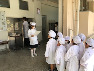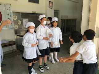 5・6年生が自然体験学習に行っているので給食委員がいません。そこで4年生が給食委員会の代わりをつとめてくれました。少し練習して、さあ本番。元気に活動できました。