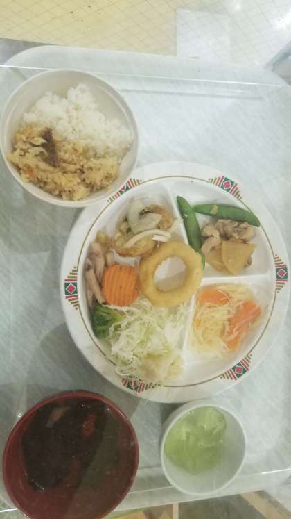 夕食のメニューです。新鮮な野菜やおかずがたくさんあります。いただきます。