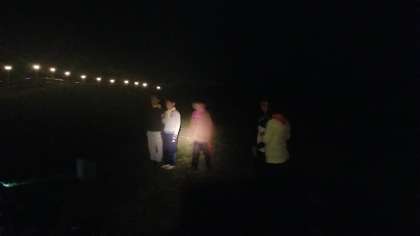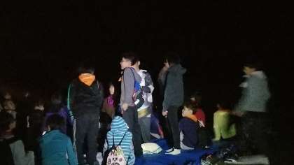 ナイトハイクの様子です。残念ながら星は見えませんが、担当児童のクイズで大盛上りです。