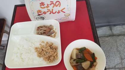 今日の給食は、豚肉のねぎじょうゆ焼き、ふきよせ煮、つな大豆そぼろ、ごはん、牛乳です。