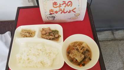 今日の給食は、鶏肉のごまだれ焼き、ソーキ汁、もやしのしょうがじょうゆあえ、ごはん、牛乳です。しっかり食べましょう。