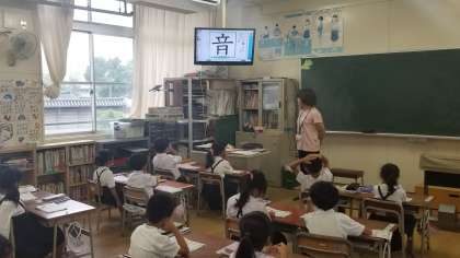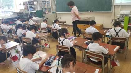 1年1組の国語の様子です。画面の漢字の書き方を確認して、先生の声にあわせて漢字を正しく書く学習をしていました。