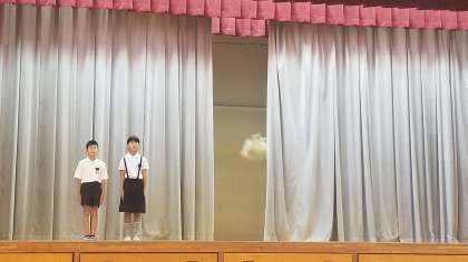 本日体育館で児童集会を行いました。今日の集会は、幕と幕の隙間から一瞬みえる物をみんなで答えました。本当に一瞬なので「何だろう」と一問一問真剣に見ていました。