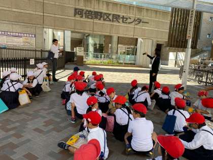 2年生が社会体験学習で阿倍野図書館に行きました。係の方に説明を受け、館内を見学しました。